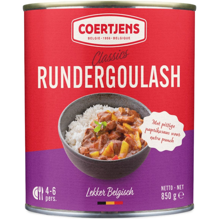 Coertjens Rundvlees Goulash is bereid met o.a. rundvlees, tomaten, paprika,uien en een heerlijk kruiden en specerijen mengsel voor een authentieke smaak.