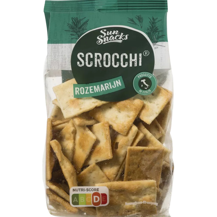 Scrocchi® is het meest populaire crackertje in Italië. Scrocchi® is Italiaans voor zoiets als “kraken”, wat refereert aan de knapperigheid van het toastje. Ideaal als snack of als onderleggertje met olijven of tapenade bij de maaltijd. Ook heerlijk om te dippen.  De variant Rozemarijn geeft een extra kruidige, mediterrane twist.