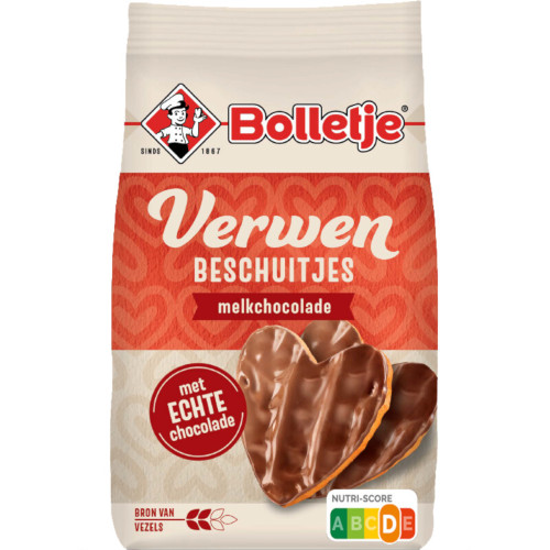 Laat je verwennen met deze luchtige en brosse **Bolletje Verwenbeschuitjes** met een heerlijke laag romige melkchocolade — perfect voor een klein verwenmomentje tussendoor, bij de koffie of als extraatje bij het ontbijt. Deze hartvormige beschuitjes zijn een bron van vezels en ideaal om te delen of gewoon zelf van te genieten.