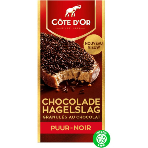 De unieke smaak van pure Côte d'Or chocolade nu ook als hagelslag. Een heerlijke toevoeging aan het ontbijt of als topping op ijs of yoghurt.