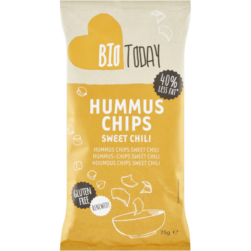 BioToday hummus chips sweet chili are made with 40% chickpeas and baked in HO (High Oleic) sunflower oil. The chips are 30% lower in fat than potato chips and have a sweet and spicy taste. The perfect organic chips for any snacking moment!
