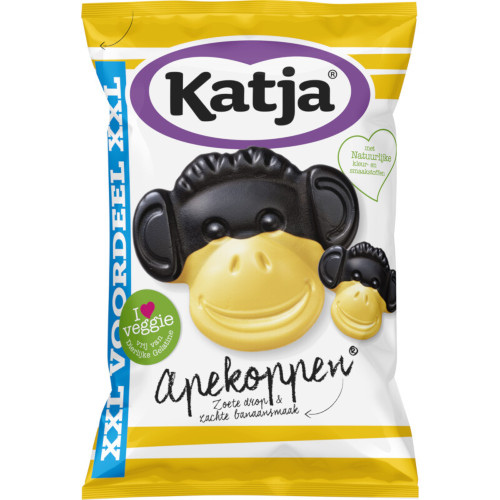Katja Apekoppen are made from sweet licorice with a soft banana flavour, which has been a favorite in the Netherlands for years. Made with natural colors and flavors and without animal gelatin, so enjoy! In an extra large bag.