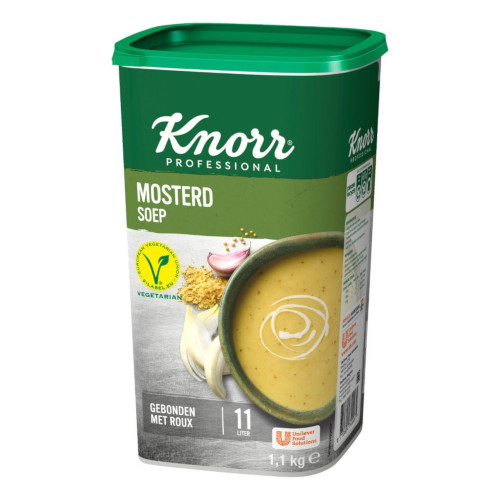 Knorr Professional Mustard Soup has a creamy and slightly spicy taste. The powder is a good basis for a tasty soup and offers room for your own creativity. This vegetarian creamy soup is free from flavor enhancers and artificial colorings. With the contents of this package you can make up to 11 liters of delicious mustard soup.