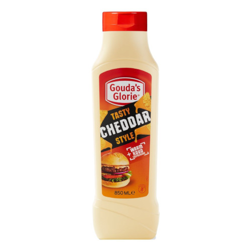 Gouda's Glorie Tasty Cheddar Style is a creamy sauce with the savory taste of Cheddar. The sauce can be served hot or cold. Delicious with french fries, nachos and on a burger.