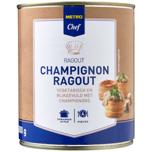Champignonragout van Metro chef, ons eigen merk. Deze vegetarische ragout is rijk gevuld met champignons en is gemakkelijk op te warmen. De champignonragout komt in een blik van 800 gram en bevat ongeveer 4 porties.